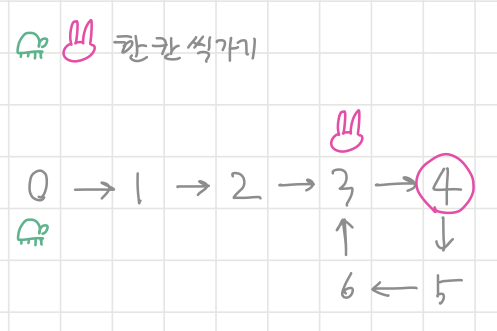 ๋น ๋ฅธ ๋ฐ๋(fast)๊ฐ ์ฐ๊ฒฐ ๋ฆฌ์คํธ ๋์ ๋๋ฌํ๋ฉด ๋๋ฆฐ ๋ฐ๋(slow)๋ ์ ํํ ์ฐ๊ฒฐ ๋ฆฌ์คํธ์ ์ค๊ฐ ์ง์ ์ ๊ฐ๋ฆฌํค๊ฒ ๋๋ค.