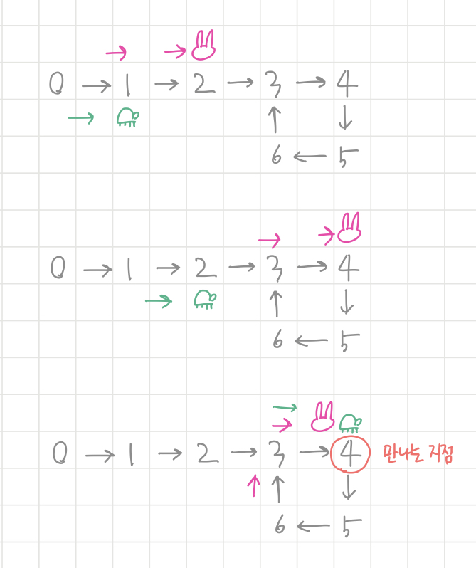 ์ฐ์ ์์ ๊ฐ์ด ๋ ๊ฐ์ ์๋๊ฐ ๋ค๋ฅธ ํฌ์ธํฐ๋ฅผ ์ฌ์ฉํ์ฌ ์ฌ์ดํด์ ์กด์ฌ์ฌ๋ถ๋ฅผ ํ์ ํ๋ ๊ฒ์ ํ ๋ผ์ ๊ฑฐ๋ถ์ด ์๊ณ ๋ฆฌ์ฆ(ํ๋ก์ด๋์ ํ ๋ผ์ ๊ฑฐ๋ถ์ด ์๊ณ ๋ฆฌ์ฆ Floyd's tortoise and hare)์ด๋ผ๊ณ ํ๋ค๋ ์ฌ์ค์ ์๊ฒ๋์๋ค.