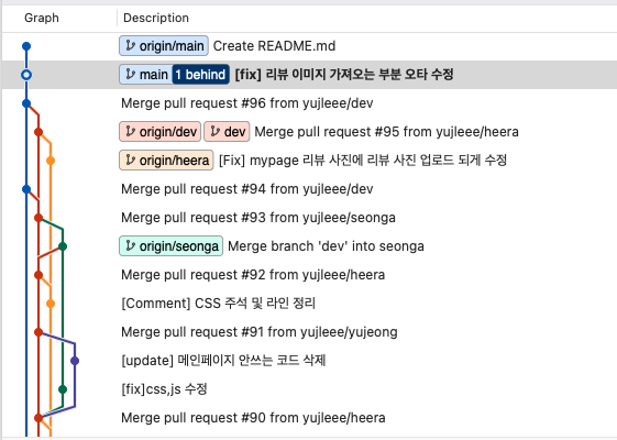 ๊ฐ์ธ ๋ธ๋์น์์ ์์ ํ dev ๋ธ๋์น์์ ๋ณํฉ, ํ ์คํธํ๊ณ ๊ด์ฐฎ์ ์ฝ๋๋ค์ main๋ธ๋์น๋ก ๋ณํฉํ๋ ๋ฐฉ์์ผ๋ก ํ์ ์ ์งํํ๋ค.