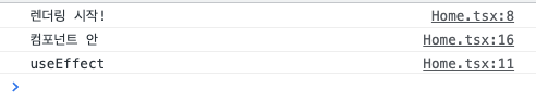 ์๋์ ๊ฐ์ด ์ฝ์์ ์ถ๊ฐํด์ ํ์ธํด๋ณด๋ ๋ค์ ์๊ฒ ๋ ๊ฒ๊ณผ ๊ฐ์ด ์ปดํฌ๋ํธ๊ฐ ๋ ๋๋ง ๋๋ return๋ฌธ์ด ๋จผ์ ์คํ๋๊ณ useEffect์ ์ฝ์์ด ์ฐํ๋ ๊ฒ์ ํ์ธํ ์ ์์๋ค.