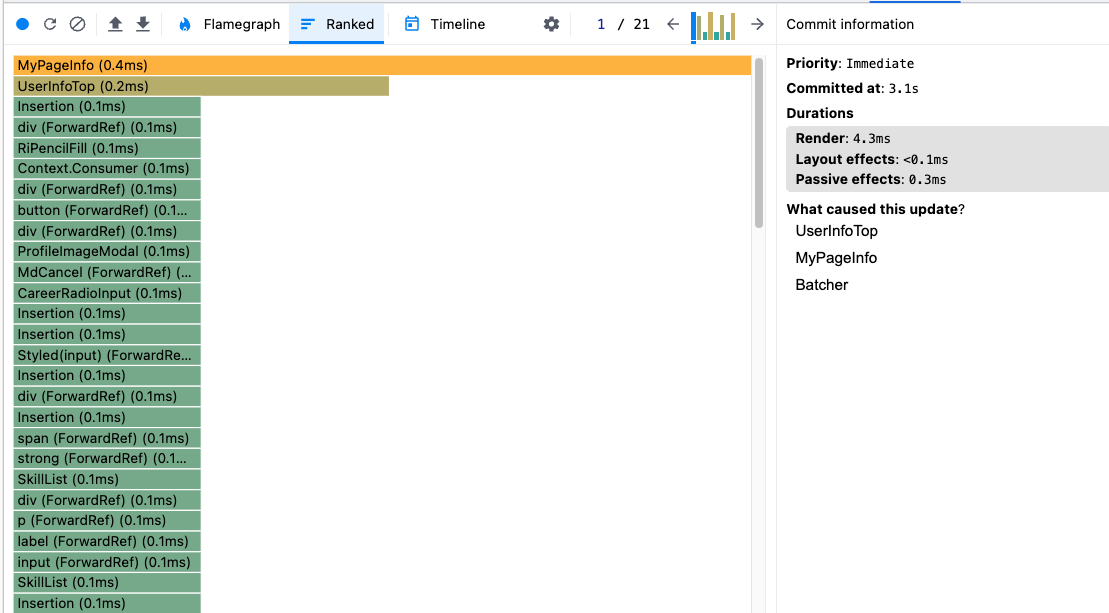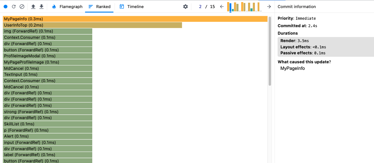 ๋ผ๋์ค ๋ฒํผ๊ณผ ์ฒดํฌ๋ฐ์ค์ memo๋ฅผ ์ ์ฉํ ํ ๋ ๋๋ง ์๋๊ฐ 4.3ms์์ 3.5ms๋ก ๊ฐ์ํ ๊ฒ์ ๋ณผ ์ ์๋ค.