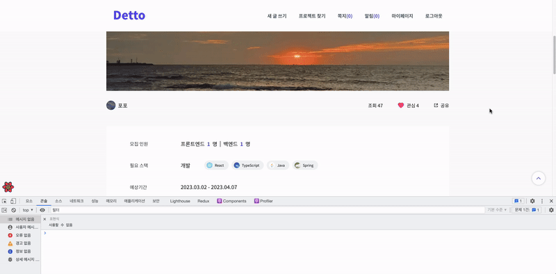 ๋ก๊ทธ๋ฅผ ๋ณด๋ฉด true๋ก myProjects ๋ฐ์ดํฐ๊ฐ ์์์ด ํ์ธ๋์ด๋ isLike๋ ๊ณ์ undefined์๋ค.
