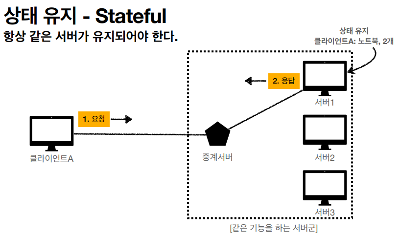 Stateful์ ํด๋ผ์ด์ธํธ์ ์์ฒญ์ ๋ฐ๋ผ์ ํญ์ ๊ฐ์ ์๋ฒ๊ฐ ์ ์ง๋์ด์ผ ํ๋ค.