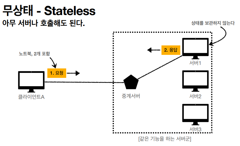 Stateless๋ ์๋ฒ์์ ์ํ๋ฅผ ๋ณด๊ดํ์ง ์๊ธฐ ๋๋ฌธ์ ์ฅ์ ๊ฐ ๋ฐ์ํ๋๋ผ๋ ์๋ฌด ์๋ฒ๋ ํธ์ถํ ์ ์๋ค.